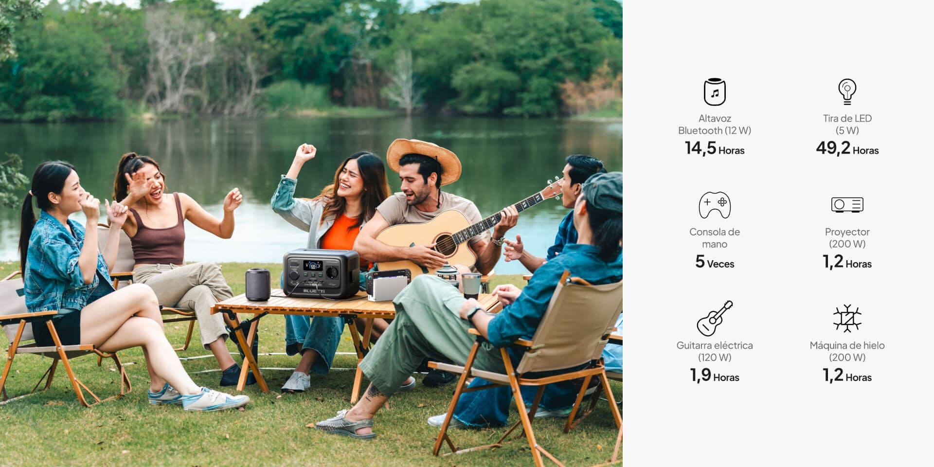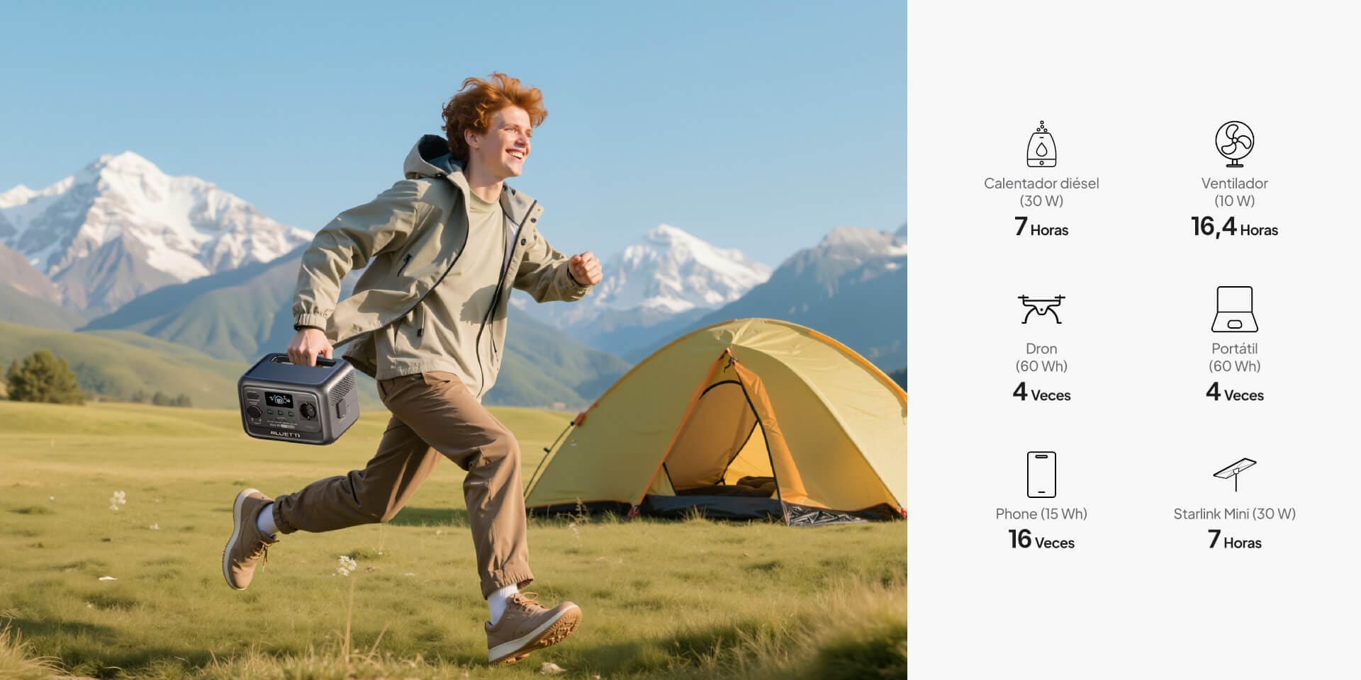 - Energía para tus dispositivos diarios: 1.500 W para lo esencial —portátiles, neveras y ventiladores—, con una potencia máxima de 2.250 W para equipos de alta demanda.